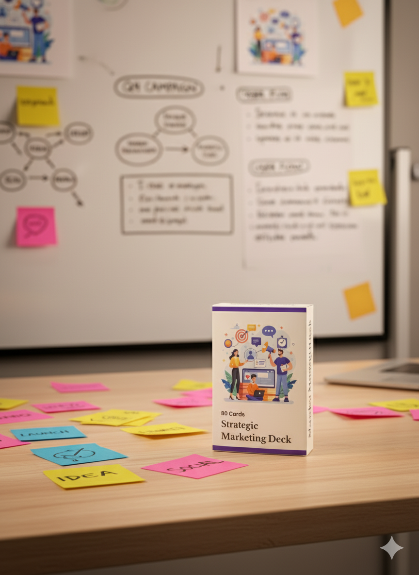 A "80 Marketing Cards" system likely refers to a specific set of tools or templates, such as a collection of pre-designed slides, prompts, or ideas, designed to guide users in creating or developing elements of their strategic marketing deck, possibly covering a wide range of marketing tactics and strategies.